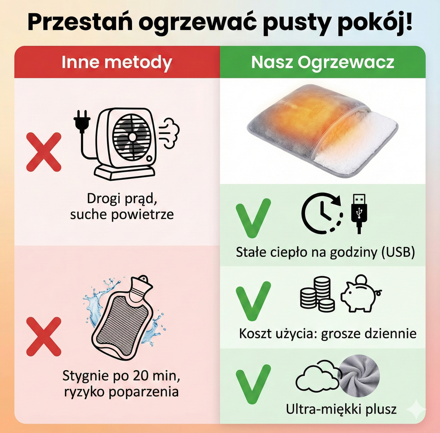 CozyFeet™ to inteligętna alternatywa. Zapewnia stałe, bezpieczne ciepło za grosze dziennie, elimując wady tradycyjnych metod.