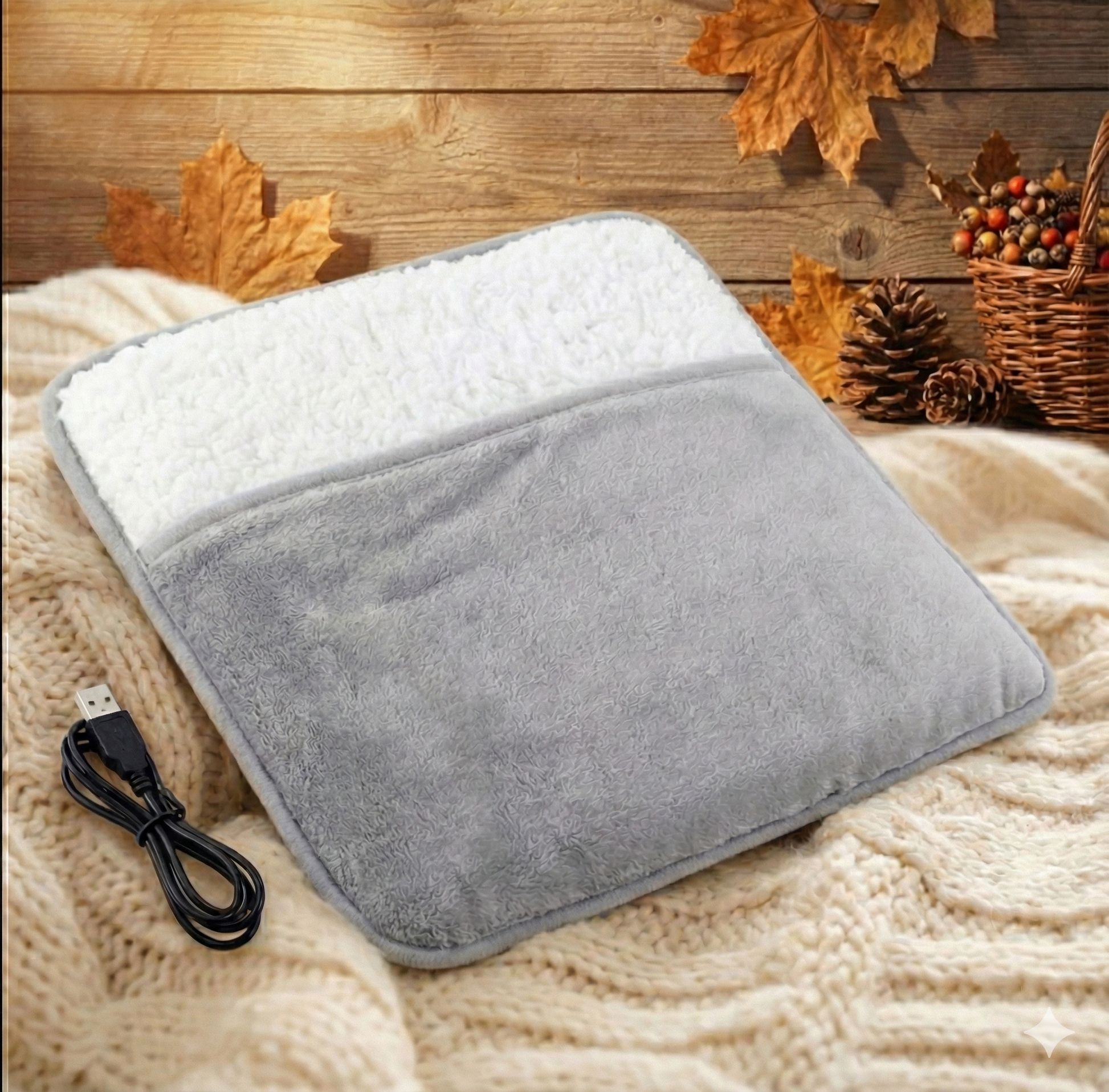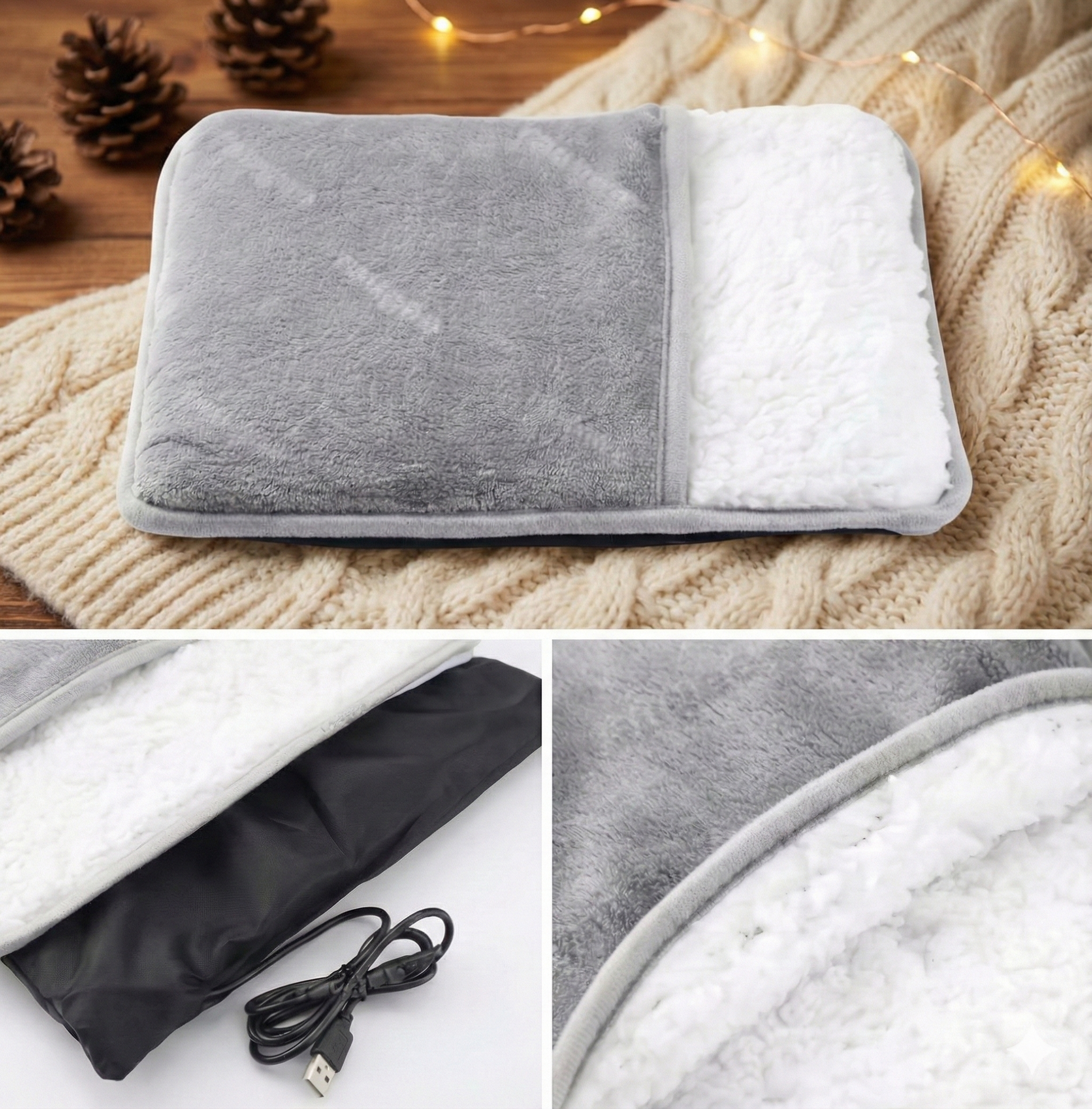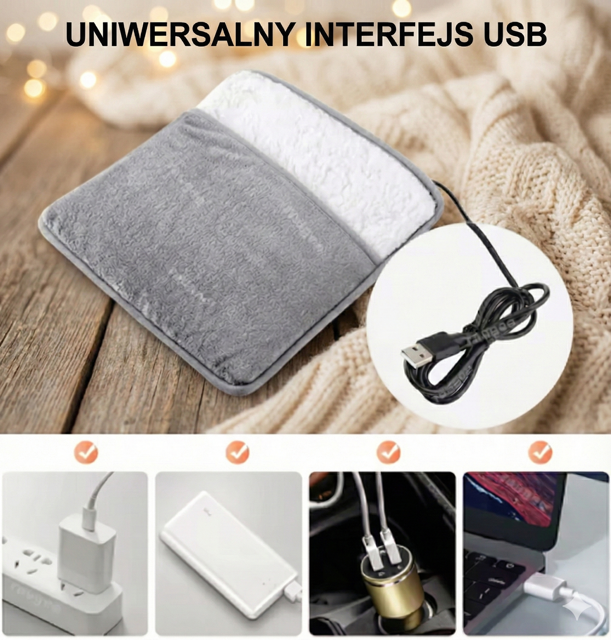 Ocieplacz zasilany jest przez kabel USB (dołączony do zestawu). Możesz go podłączyć do laptopa, ładowarki do telefonu, a nawet do powerbanka, co czyni go w pełni mobilnym!